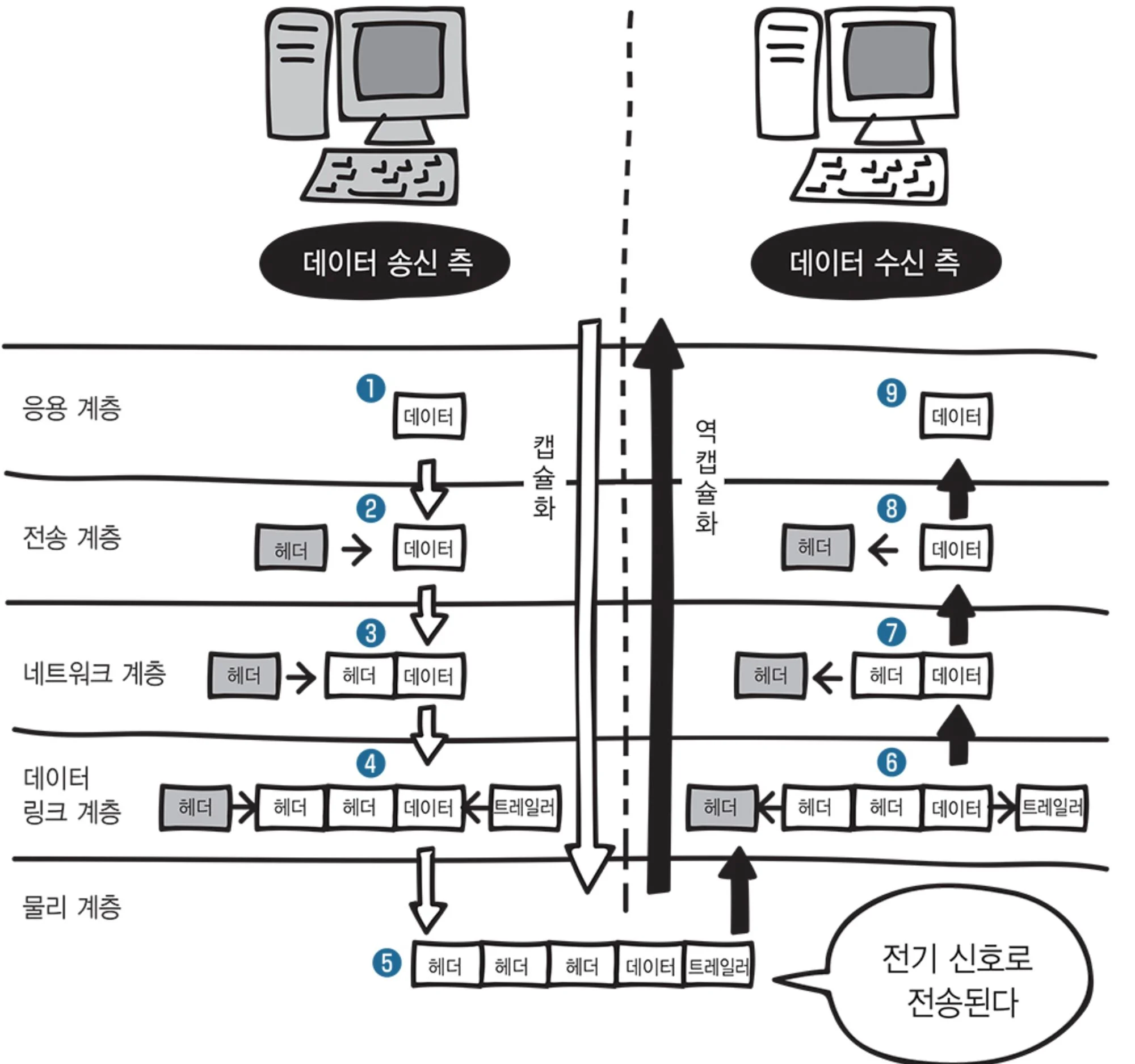 응용 계층(응용 프로그램)에서 발생한 순수한 데이터는 송신 측에서 각 계층을 거처갈 때마다, 해당 계층에서 정의된 추가적인 정보들이 헤더 혹은 트레일러의 형태로 붙어나간다. 이 과정이 마치 데이터를 감싸나가는 모습과 유사하며, 이를 캡슐화라고 부른다.